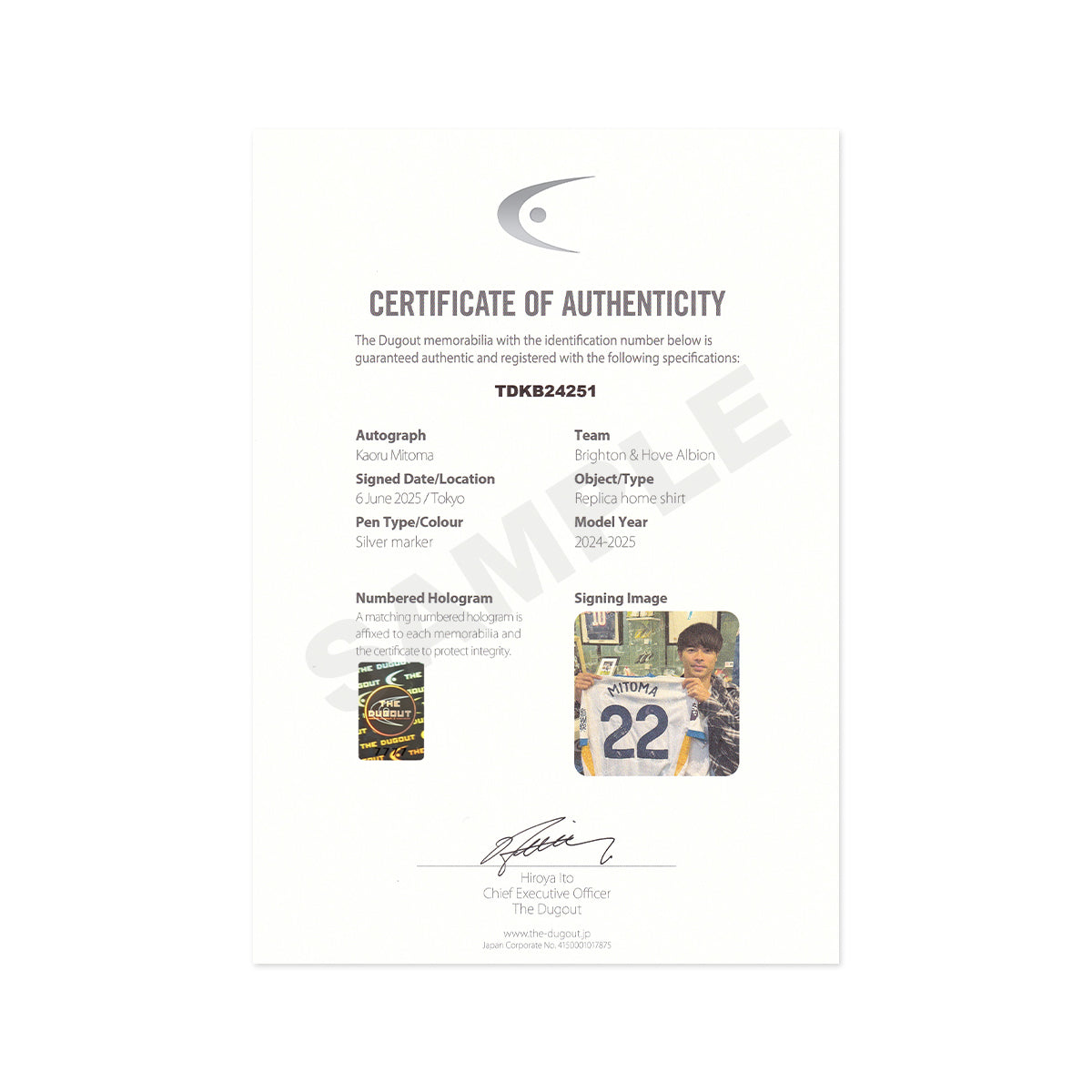 ・2025年6月に東京で行われたサイニングセッションにて執筆された三笘選手の直筆サイン入りユニフォーム。背番号の上にシルバーペンでオートグラフが書かれています。